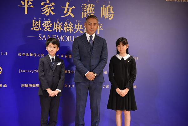 すべて見る市川團十郎と市川ぼたん、市川新之助の親子が11月18日、新初春歌舞伎公演として新橋演舞場で1月に上演される『平家女護嶋 恩愛麻絲央源平 -SANEMORI PARTII-』の取材会に出席した。
