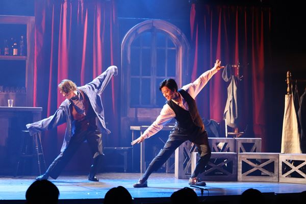 閉店を控えたバーで起きた騒動と人間模様に加え、リチャード&オスカーがもともと上演しようとしていた『ブルックリン・ブリッジの伝説』、スティーヴィーが持ち込んできた『ミア・ファミリア』という2本の劇中劇が並行して綴られていく。たった3人のキャストは目まぐるしく役を変え、芝居に歌にダンスに女装に客席降りにと八面六臂の活躍。俳優たちが汗をかきかき大奮闘する中で、彼らの素の魅力も見えてくる。笑いをたっぷりまぶしながらもキャラクターの心情を切々と歌い上げるナンバーもあり、しかしあくまでも賑やかに――“韓国小劇場ミュージカル”の王道のようなミュージカルだ。