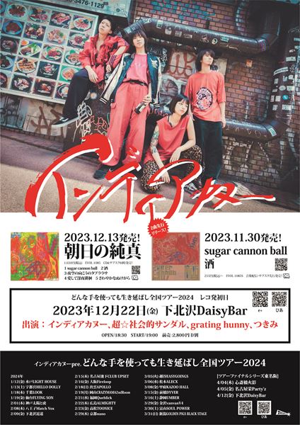 また、12月22日(金) に下北沢DaisyBarで開催される『インディアカヌーPre.「どんな手を使っても生き延ばし全国ツアー2024」』初日公演の全出演アーティストが発表された。インディアカヌーのほかに、つきみ、grating hunny、超☆社会的サンダルといった親交の深い3バンドが出演予定で、チケットは現在一般発売中。