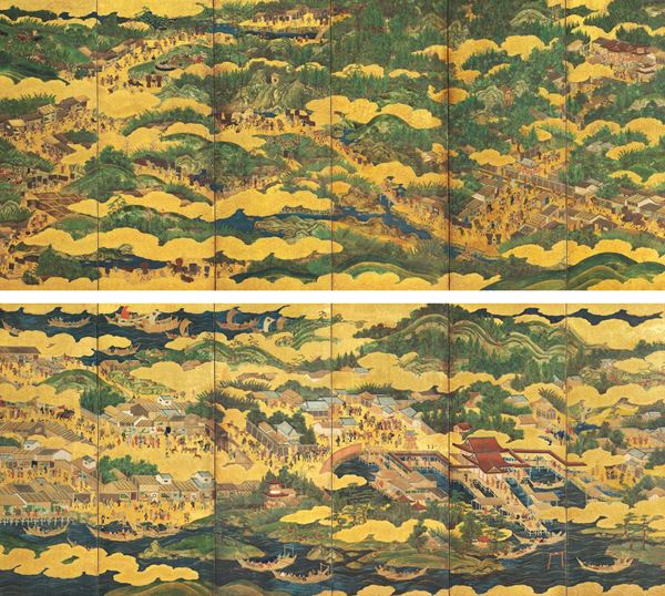 同展の見どころのひとつは、最初の「金雲の間」で、「金雲」の様々な演出効果に注目した深掘りの紹介があることだ。画面上にたなびく金の雲「金雲」は、現実には存在しないもので、何を意味するかも明確にはわかっていないという。だが、この日本独自の特異な「金雲」を、日本の画家たちは様々な用途をあてて使いこなしてきた。例えば、画面の荘厳、空間の奥行きの表現、場面転換、不要なものの隠蔽など、その効果は実に多彩だ。狩野派が得意とした力強い金雲や、大和絵の絵師が好んだ雅やかな金雲といった様々な表現とともに、金箔や金の切箔(きりはく)、さらに金泥といった異なる手法による効果の違いも味わうことができる。
