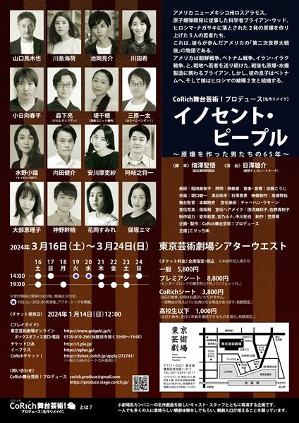 『イノセント・ピープル 〜原爆を作った男たちの65年〜』は、2024年3月16日(土) から24日(日) に東京・東京芸術劇場シアターウエストで上演される。