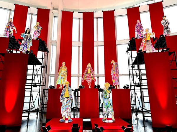 会場に足を踏み入れると、真紅のバックドロップ(布製の垂れ幕)で彩られた窓面をバックに、描き下ろしビジュアルによる主要キャラクター11体の等身大パネルが観客を出迎える。その左手奥には主人公、花垣武道と、マイキー(佐野万次郎)の実物衣装が、六本木の景色をバックに展示されている。未来を救うために過去を変えた武道とマイキーの間に「東京タワー」がそびえ立つ光景は、ファンにはたまらなく感動的に映るだろう。