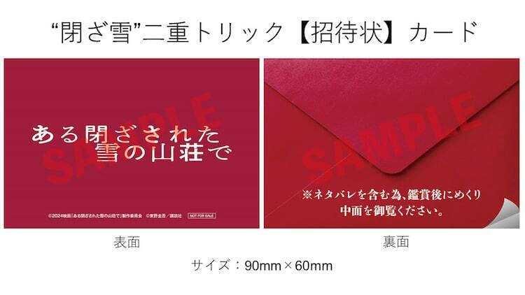 「“閉ざ雪”二重トリック【招待状】カード」と題された入場者プレゼントは、二重三重のトリックが張り巡らされている本作をいち早く劇場で鑑賞した観客のために用意された特別仕様。裏面の絵柄をめくると、“ある写真”が現れる二重構造のミニカードとなっている。中身は本編のラストにかかわるネタバレが含まれており、「映画鑑賞後に確認推奨」「中身のSNSへのアップは禁止」とされているためご注意を。YouTubeでは、重岡と中条がこの入場者プレゼントを開封する動画が公開中だ。