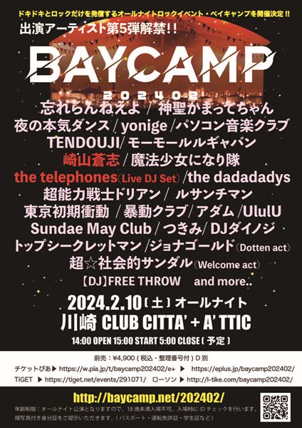 『BAYCAMP 202402』第5弾出演アーティストで崎山蒼志、the telephones参戦決定