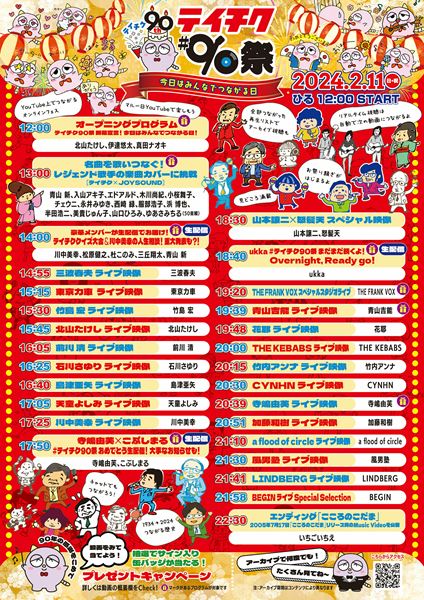オープニングを飾るのは、テイチク70周年記念アーティストとしてデビューした北山たけしと、伊達悠太、真田ナオキの3人。「テイチク90祭 開幕宣言!」と題したトーク番組で、それぞれのテイチク愛がたっぷり語られる。また14時からは現役歌手でテイチク在籍年数が最長の川中美幸を筆頭に、松原健之、杜このみ、三丘翔太、青山 新が生配信で登場。テイチククイズ大会などで視聴者にも楽しく分かりやすく90年の歴史を紹介するほか、2月21日(水) に発売される川中の新曲「人生日和」にかけて、川中が生配信で人生相談に乗る特別企画も開催される。