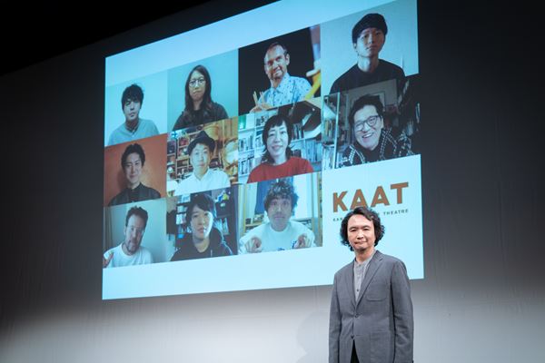 KAAT 神奈川芸術劇場 2024 年度ラインアップ発表会より、スクリーン手前中央 長塚圭史、スクリーン内(上段左より、兼島拓也、田中麻衣子、アンディ・マンリー、加藤拓也/中段左より、藤田俊太郎、南条嘉毅、山田うん、池上高志/下段左より マシュー・レントン、下島礼紗、山本卓卓 (撮影:加藤甫)