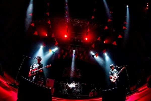 暗闇の中で斎藤宏介(Vo/Gt)、田淵智也(Ba)、鈴木貴雄(Ds) が登場して始まったユニゾンのライブは、足元を確かめるような素振りなど一切なく、「サイレンインザスパイ」から完全にぶっちぎるスタイル。巧みに重ねられる3人のフレーズやキレの良い歌声もそうだが、単純に音の精度が高すぎるのだ。ライブを待ちわびていた観客をそのサウンドで一気に惹きつけ、瞬く間に沸騰させ、斎藤の短い挨拶から鈴木のしなやかなドラムも冴え渡った「kaleido proud fiesta」に繋ぎ、イントロで大歓声が上がった「スロウカーヴは打てない(that made me crazy)」、高い強度を誇りながら緊張と緩和を行き来する面白さもある「天国と地獄」へ。興奮に誘われた観客も突き上げた拳を下ろす瞬間がない。一歩間違えれば破綻してしまいそうなトリッキーなギターリフやソロ、メロディの動きが至極当然のように1曲としてまとまっており、彼らのサウンド構築の素晴らしさを見せつけてくれるのだ。