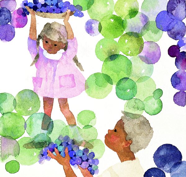 科学の視点から企画された興味深い展示もある。ちひろが愛した紫色は、生態学的には、植物が動物と共生関係を結ぶために進化させた花や熟した果実の色なのだとか。様々な紫色を「共生の色」として注目した後には、ぜひ、美術館の庭へ。「共生の庭」と名づけられた庭では、絶滅が心配されるサクラソウや、絵本『あかまんまとうげ』にも登場するワラビやフキも目にできる。実物の植物を実感することで、地球の未来に想いを馳せる機会ともなるだろう。