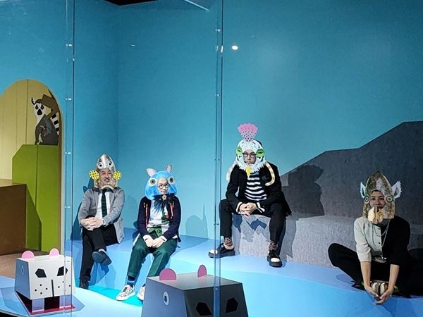 会場に入る前から、会場外のチケット売場や入口のスタッフが、生きものの顔みたいなお面をかぶって、え、何?!展覧会の見どころのひとつ「お面」については、後で伝えることにして、まずは会場を見てみよう。