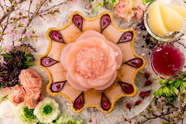 桜シブーストにルレクチエのコンポートを組み合わせた「金平糖型 桜のシブーストとル レクチエのタルト」は、お花の形を思わせるその華やかなタルト型にも注目です。蜜漬けの桜の花が、より春らしさを盛り上げます。
