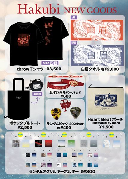 併せて、ツアーグッズのデザインも公開。収録曲「Heart Beat」の世界観を表現したHeart Beatポーチや、ツアースケジュールがプリントされたthrowTシャツなど充実のラインナップとなっている。さらに、オフィシャルメンバーシップ「ゆるはくびの里」では、会員来場特典も決定。来場特典はHakubiメンバーが監修したすごろくシート、「ゆるはくびの里」でチケットを購入した人は村長ダイカットステッカーがもらえる。