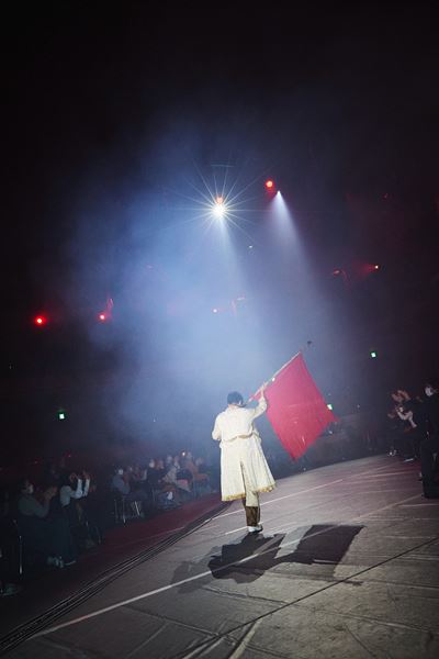 一転、相撲の寄せ太鼓のリズムが鳴り響いたかと思うと、そこに壮大なオペラのシンフォニーが被さる。弦楽の旋律と和太鼓の拍子が完全に合わさったこのマッチングはいったい何を示唆しているのだろう。会場にはそのままバリトンの美声がこだまし続けている。オペラ「カルメン」で歌われる有名なアリア「闘牛士の歌」だ。勇ましいメロディから歓喜に満ちたメロディに切り替わる瞬間、直太朗が真紅のフラッグを振りながら登場した。ステージの真ん中にフラッグを立てると、それがそのままマイクスタンドになり、1曲目「生きてることが辛いなら」の歌唱に移り、〈番外篇〉がスタートした。
