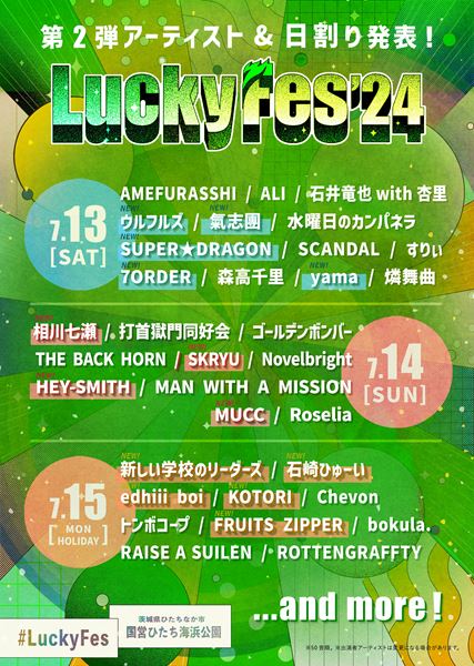 『LuckyFes』は、世代・ジャンル・国境を超えた「音楽のクロスオーバー」をコンセプトに掲げた野外音楽フェスティバル。このたび第2弾アーティストとして、相川七瀬、新しい学校のリーダーズ、石崎ひゅーい、ウルフルズ、edhiii boi、氣志團、KOTORI、SUPER★DRAGON、SKRYU、7ORDER、FRUITS ZIPPER、HEY-SMITH、MUCC、yamaの14組の出演が決定した。