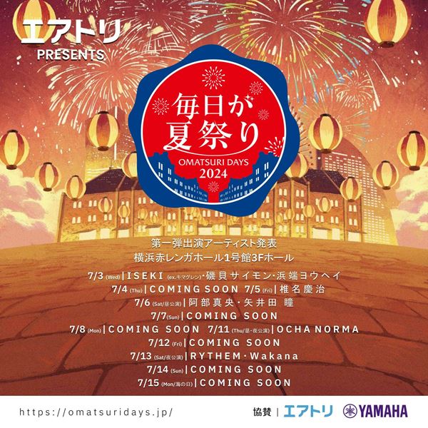 『エアトリpresents 毎日が夏祭り2024』が、7月3日(水) から15日(月・祝) にかけて神奈川・横浜赤レンガ倉庫1号館3Fホールで開催されることが決定した。