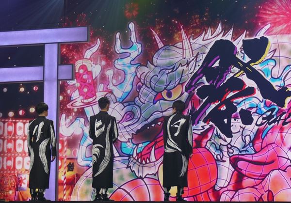 背中にコシノジュンコによる直筆文字がデザインされた衣裳を披露する3人
