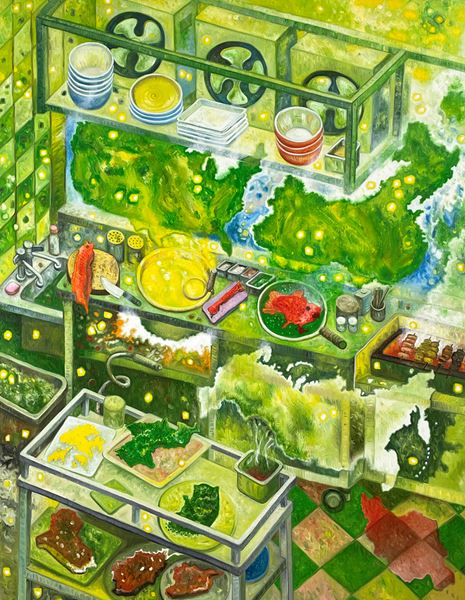 地球環境、エネルギーや人口に関する問題、パンデミック、戦争など世界中で起こるさまざまな事象に対して、身の回りの身近な視点から地球規模の視点にまでスケールを変えて考え、風刺に満ちた独自の世界観をユーモアも交えて表現する大岩。今回はタコのような架空の水生生物「オイル・オクトパス」というキャラクターが絵画などの中に登場。渋谷ヒカリエの中を漂流し、訪れる人を導く。8階のギャラリースペースでの展示をはじめ、B3階、2階、7階に巨大バナーやシートが掲出される。