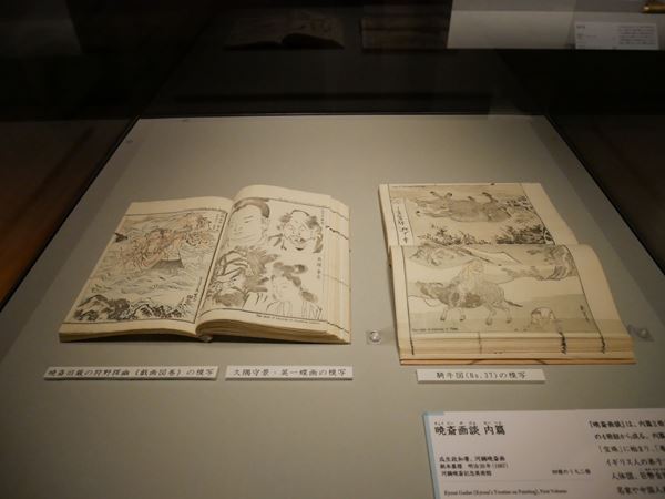 また第3章では、暁斎自身が挿絵を描いた《暁斎画談》を展示。宋元の名家や、雪舟などの中世絵画、歴代狩野派絵師、土佐派、円山派、尾形光琳、谷文晁、鈴木春信や喜多川歌麿、葛飾北斎らの浮世絵といった、先人たちの作品の模写が多数描かれており、暁斎がいかに過去の名品を研究していたかがうかがえる。