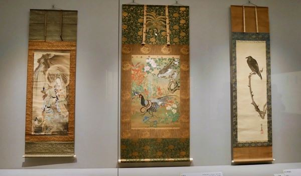 右:河鍋暁斎《枯木寒烏図》 一幅 明治14年(1881) 榮太樓總本鋪 展示期間:3月4日(月)まで/中央:河鍋暁斎《花鳥図》 一幅 明治14年(1881) 東京国立博物館 展示期間:2月18日(月)まで/左:河鍋暁斎《観世音菩薩像》 一幅 明治 12〜22年(1879〜89) 日本浮世絵博物館 展示期間:3月4日(月)まで