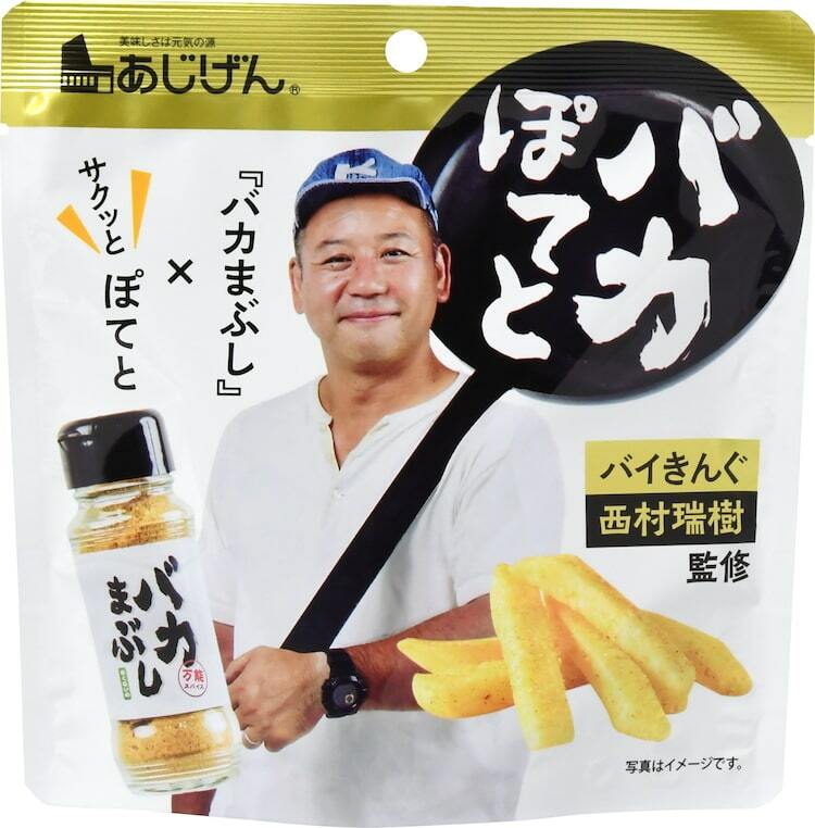 バイきんぐ西村が監修した万能スパイス「バカまぶし 辛くないの」味のポテトスティック「バカぽてと」が有限会社味源より、西日本のマックスバリュで4月14日に発売された。