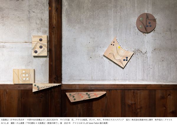生活の中の些細な出来事から着想し、インスタレーション、映像、絵画、テキストなどを制作する今村。一方、10歳の頃に失明し、鍼灸を生業とする光島は、テープやカッティングシートを用いた「さわる絵画」「触覚コラージュ」などを制作している。ふたりは2018年、きょうと障害者文化芸術推進機構が運営するart space co-jin(京都府)が携わるプロジェクト「アートと障害のアーカイブ・京都」で出会った。2023年には京都で展覧会『今村遼佑×光島貴之<感覚の果て>』を開催。今回の展示では、その出展作品も一部展示される。