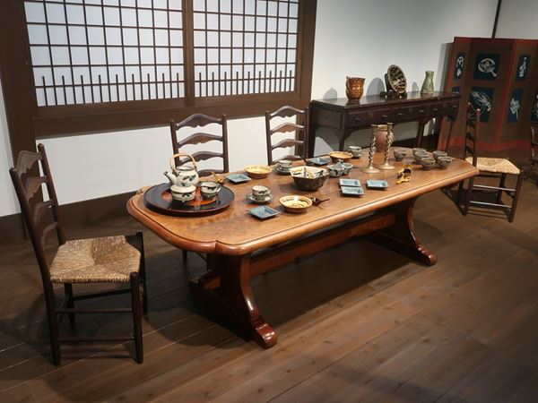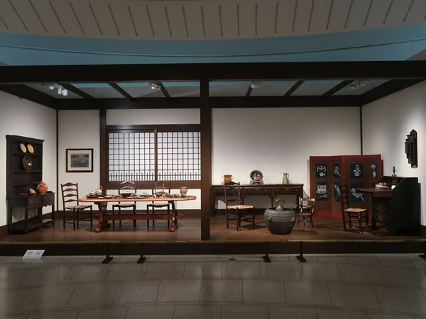 食器類と燭台がセットされたテーブルを中心に、味わいのある家具や品々が飾られた居室は、柳が東京・目黒の日本民藝館で1941年に開催した「生活展」の再現を試みたもの。暮らしのなかで民藝を活かすライフスタイルを提案した生活展は、当時としては画期的なテーブル・コーディネートも取り入れていた。