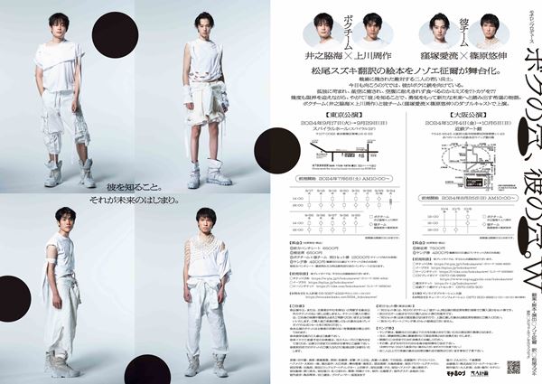翻案・脚本・演出を務めるのは、卓越した発想力と機知に富んだ演出で奇想天外な世界観を愛情一杯に描くノゾエ征爾。キャストは、井之脇海・上川周作ペアの〈ボクチーム〉、窪塚愛流・篠原悠伸ペアの〈彼チーム〉と、2チーム・ダブルキャストで上演される。