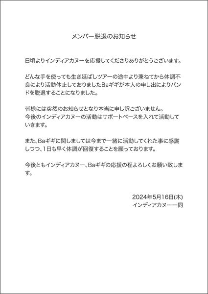 すべて見る東京・下北沢を中心に全国で活動中のオルタナティブロックバンド・インディアカヌーのギギ(Ba.)が脱退することが発表された。