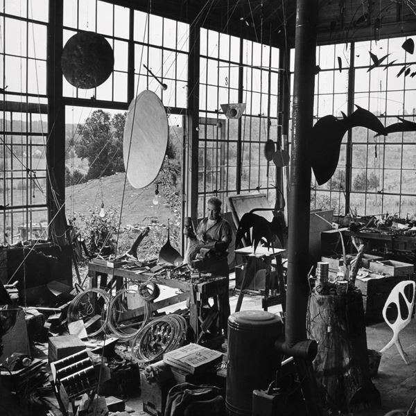 アレクサンダー・カルダーは1898年ペンシルベニア州ローントン生まれ。アメリカのモダンアートの先駆者のひとりとして活躍し、1976年にニューヨークで逝去。針金を曲げたり捻ったりしてつくった抽象的な構成要素を天井から吊るし、それらが気流や風などによって動き、絶えず変化しながら調和的なバランスを保つ「モビール」を発明した、動く彫刻「キネティック・アート」の第一人者でもある。
