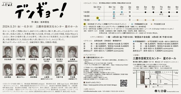 小松台東『デンギョー!』は、6月9日(日)まで、東京・三鷹市芸術文化センター 星のホールにて。上演時間は約2時間。