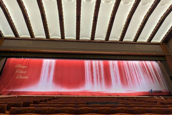 ※歌舞伎座では、黒・柿・萌葱の「定式幕(じょうしきまく)」を引幕(ひきまく)として用いているが、今回のような襲名披露・初舞台の際には、後援会や御贔屓の方から俳優に提供される特別な引幕として、「祝幕(いわいまく)」を定式幕の替わりに用いることもある。