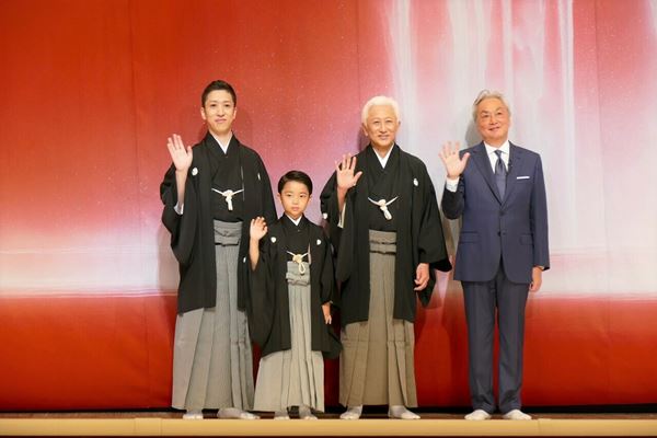 一方、獅童は、ビートたけしが原画を提供した経緯について、自身が出演した“北野武”監督名義の映画『首』での縁だと説明し、「ずっとたけしさんのファンでしたし、ぜひにとお願いしたら、すぐに『やる』と言ってくださった」と感謝の意。画家としても活動するたけしから、描きためた数点が提供されたといい、陽喜と夏幹の意見も聞きながら、祝幕のモチーフに風神雷神が選ばれ「こんなに素敵な祝幕を送ってくださり、胸がいっぱいです」と感激しきり。たけしからは「この度の初舞台、誠におめでとうございます。これからの歌舞伎界を担っていくお二人及び皆さまの輝かしい未来を、心よりお慶び申し上げます」とお祝いのメッセージが届けられた。