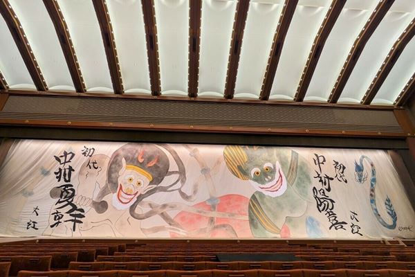 「六月大歌舞伎」を彩る祝幕がお披露目、ビートたけしが描いた“風神雷神”が中村陽喜・夏幹の初舞台を祝う