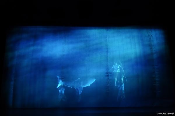 さらにもうひとつ水中のシーンで忘れられないのが、磁気拘束具をつけられ、海に放り投げられたコナンをラナが救うシーン。アニメでも特に感動的だったあの名シーンが、舞台上で完全に再現されている。だがそこから受ける印象は、アニメとはまた異なるものかもしれない。命が危うい切迫した状況ながらも、その空間は非常に静謐で、とにかく美しい。そして最小限の歌と音楽が、ふたりの絆の強まりを非常に効果的に表している。