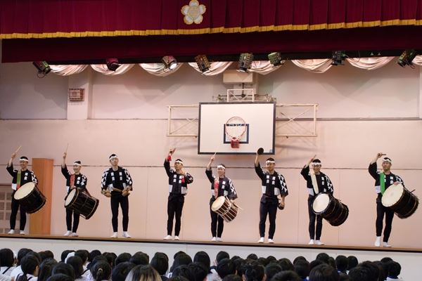 取材を行ったのは、浅草にある田原小学校での演奏の様子。この時点で3つの小学校・幼稚園を回ってきたということで、鼓童のメンバーは緊張感もありつつリラックスした状態だ。「鼓童の皆さんです!」と紹介がされると、集まった児童は割れんばかりの拍手で出迎える。鼓童メンバーも笑顔でステージに上がり、太鼓が中心の迫力ある演奏を披露した。曲終わりのMCでは、「新潟県の佐渡島から来ました」という挨拶に大きな歓声が。児童からの質問も飛び交い、わきあいあいとした雰囲気の中で2曲目がスタート。笛の美しいメロディに太鼓の勇ましいリズムが加わり、目にも耳にも楽しい演奏が繰り広げられた。
