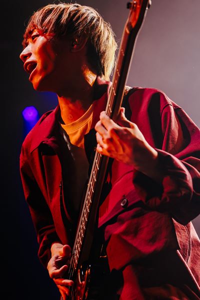 その見事な伏線回収に感嘆の声が上がるうえ、ミュートをはさんでボリュームをアップ&ダウンするなどの遊び心を交えたアクトでオーディエンスはもれなく笑顔に。楽しさもマックスになるが、次はアグレッシブな「才能」でムードを変え、巻き舌気味のボーカルや切り裂くギター、ベーススラップで拳を突き上げさせると、曲後の歓声もひと際大きくなる。しかし、まだまだとばかりに続くのは木島オンリーのドラムソロ。高速の切れ味鋭いドラミングには客席もたかぶるばかりだ。
