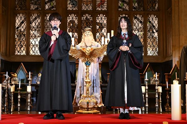 当日はハリーたちが食事をするホグワーツの大広間で、ダンブルドアに扮したタレントのハリー杉山の司会進行の下、ハリー・ポッターの吹替でお馴染みの声優・小野賢章と、自他ともに認めるハリー・ポッターファンの俳優・山本美月が登壇。1周年を記念した4段からなる大きなアニバーサリーケーキに「インセンディオ!」という火をおこす呪文を唱えて点灯した。