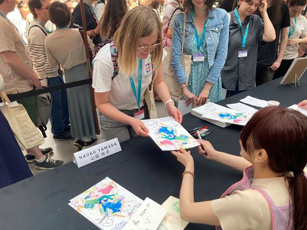 その後行われたサイン会では、性別、年代、国籍問わず多くの人が押しかけ300人を越える長蛇の列が。過去作のコンテ集を持ってきた青年がいたり、お年寄りの夫婦が熱心に話しかけたりと、現地での山田監督への関心度は非常に高かった。監督本人も言葉の壁を越え笑顔や身振り手振りで応えるなど、現地のファンとのコミュニケーションを楽しんでいた。