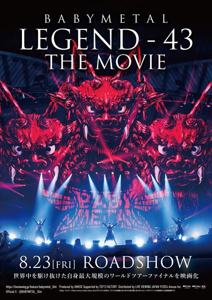 『BABYMETAL LEGEND - 43 THE MOVIE』は、8月23日(金) より全国47都道府県、66カ所の映画館で公開。5.1chサラウンド版に加え、リアルで多角的な立体音響が味わえるDolby Atmos版、最新鋭の映像技術×立体音響×卓越したシアターデザインにより“極上のシネマ体験”を堪能できるDolby Cinema版の3形式での上映を予定している。