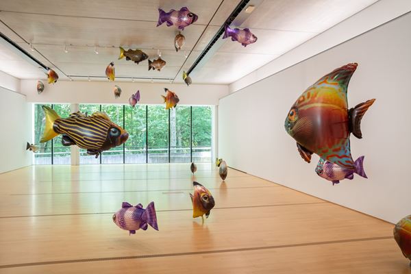 例えば魚のバルーンはパレーノのおなじみのモチーフだが、同展では、窓越しに森が見える展示室が水槽のようになり、魚たちが重力やスケール、時間の流れといった地上の法則から解放されて泳いでいるように見える。天候や光、空気の流れ、鑑賞者の動きがバルーンに作用し、偶然性を含む変化をもたらすのだ。
