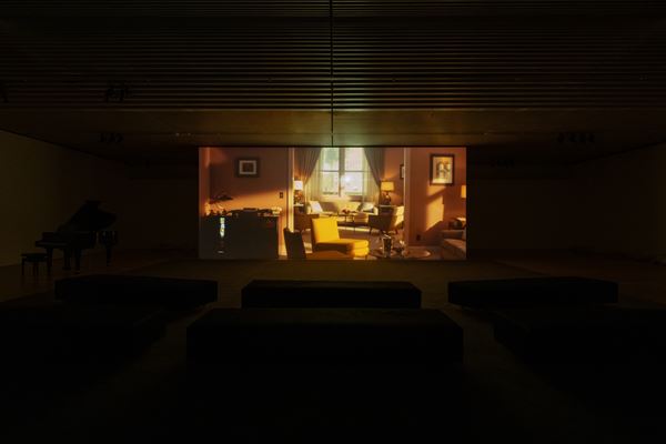 また、ポーラ美術館の新収蔵作品でもある2012年の映像作品《マリリン》を、自動演奏ピアノ、溶けて半分汚れたような人工雪《雪だまり》、太陽光を捉える巨大ミラー作品《ヘリオトロープ》とともにひとつの舞台空間のごとくしつらえたのも初めてのことだ。《マリリン》は、マリリン・モンローが映画『七年目の浮気』のロケのときに住んでいたニューヨークの高級ホテルのスイートルームを舞台とした作品。人物は登場せず、声や手書き文字などで不在の存在を浮かび上がらせていく。映像が終わると空間が劇的に変化していくので、ぜひ最後まで体験してほしい。