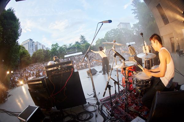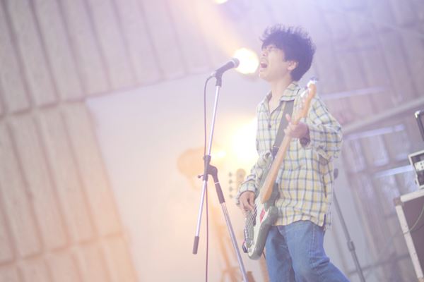 開演時刻は17時。まだまだ明るい野音にジョイ・ディヴィジョン「Disorder」が鳴り渡る。〈I've got the spirit, but lose the feeling〉――「魂はあるが、感情は失った」と繰り返すこの曲が終わる頃、ステージにフジタレイ(g)、タカハシコウキ(b)、オオモリユウト(ds)が現れた。そして最後にカワノ(vo/g)が登場。黒のスラックスに白いシャツという、ちょっとフォーマルないでたちだ。そのままギターを手に取り、おもむろに歌い始めた1曲目は「WASTAR」。野音という場所のもつ独特の空気を切り裂き、塗り替えていくように、鋭いバンドサウンドが鳴り響く。フジタが一心不乱にギターをかき鳴らす横でカワノは絶叫し、ギターをもった手を大きく広げてみせる。