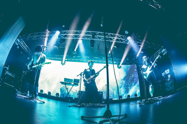 拍手と歓声に迎えられ最初にステージに現れたのはDyna(b)。ジョイ・ディヴィジョンのアルバム『Unknown Pleasure』のジャケを思わせる波形が流れる映像を背に、Zen(vo&g)やShu(vo&g)の声もリミックスされたSEがオーバーチュアのように会場に広がっていく。冒頭「Nautilus & Nemo」を歌うShuのハイトーンは神々しさをまとっていて、Zenもステージに現れ3人が揃ったところで「浮世」へ。「So so dirty」というフレーズで始まるこの曲をZenがセンターにあるマイクで歌い始める。ドシャメシャに歪んだギターと、アジテートするようなボーカルがこの曲をよく現している。
