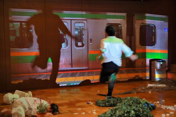5名の取り組み方は様々だ。森洋樹は、美術館までの道のりで目にした山や川、湖、ダム、ビル、家などをモチーフに、館までの風景を木彫で表現する。館にふり注ぐ光ゆえに、建物や周辺環境の表情が変わることに注目した石田真澄は、撮り下ろし写真でインスタレーションを制作。光岡幸一は、文字を書いたテープを建物に貼る手法を用いて「新たな導線」をつくり、美術館で過ごす人々の認識や動きを変えていく。