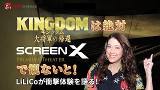 LiLiCoが観たのは、『キングダム 大将軍の帰還』の【ScreenX with Dolby Atmos版】。LiLiCoは劇場内に入ると、関東最大級の全長約50mのスクリーンの大きさに「このスクリーンが全部『キングダム』になるんですねー!」 と驚き、興奮気味。映画の鑑賞を終えると、「みんな想像すると思うんです。270度のスクリーンとは? どういう風に包み込まれるのか?と──。想像をはるかに超えた! 知らないうちに入っちゃってます! キングダムの世界観に浸ってる感じ」と、大絶賛だった。