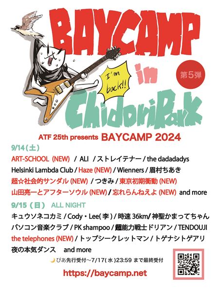 9月14日(土)・15日(日) に神奈川・ちどり公園で開催される野外音楽フェス『ATF 25th presents BAYCAMP 2024』の第5弾出演アーティストが発表された。
