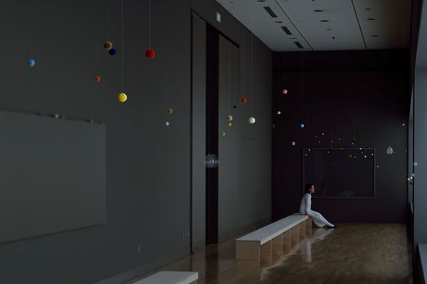 また、天井から吊り下がる小さなガラスビーズの作品は、展示室に制作に入ってから新たな気づきがあり、制作したもの。現場に入ってからこの規模の新作を作りはじめるのは初めてだったという。さらに、壁面の絵画の連作《color beginning/breath》は制作順に展示。銀座メゾンエルメス フォーラムの個展にて展示される作品群とつながるという。