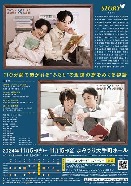 本作は、2009年にブロードウェイで初演され、とても小規模な作品にもかかわらず、ドラマ・デスク・アワードでミュージカル部門作品賞を含む4つの賞にノミネートされた、音楽・作詞ニール・バートラムと脚本ブライアン・ヒルによるミュージカル。日本では2019年の初演を田代万里生×平方元基ペアが役替わりで上演、2021年には初演のふたりに太田基裕×牧島 輝ペアが加わり、2ペアで再演して好評を博した。今回は太田×牧島ペア、山崎大輝×小野塚勇人ペアで待望の再々演を迎える。
