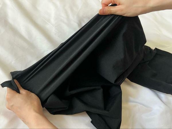 素材はポリエステル100%で、綿とウィンドブレーカーのようなシャカシャカとした生地のちょうど中間のような触り心地です。綿のような柔らかさはありませんが、とても軽く、肌に触れてもサラッとしています。