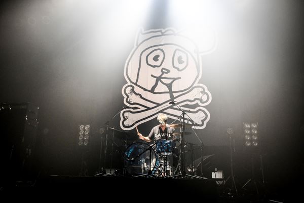 今夜のO-EASTは、中畑大樹という人の空気感がそのまま流れているかのような場になっていた。入口には中畑のために届けられた花の数々。フロア内に流れる音楽は、VOLA & THE ORIENTAL MACHINE、杉本恭一、北出菜奈、チリヌルヲワカ、長瀬智也とのKode Talkersという、彼がドラマーとして関わってきたバンドやアーティストたちの曲。そしてステージの後ろの幕に大きく浮かび上がっているのは、このイベントのために中畑が描いたイラストだ。それは毒もユーモアもあるようで、しかしそのどっちにも着地していない感じがちょっと中畑らしい気がした。