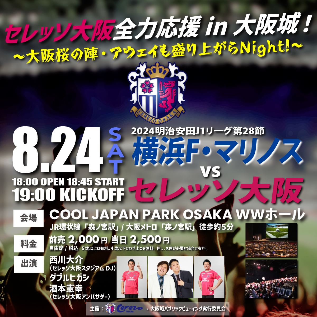 8月24日(土)横浜F・マリノス戦にて、セレッソ大阪アウェイゲームのパブリックビューイングイベント『セレッソ大阪 全力応援 in 大阪城!~大阪桜の陣・アウェイも盛り上がらNight!~』が、COOL JAPAN PARK OSAKA WWホールにて開催される。